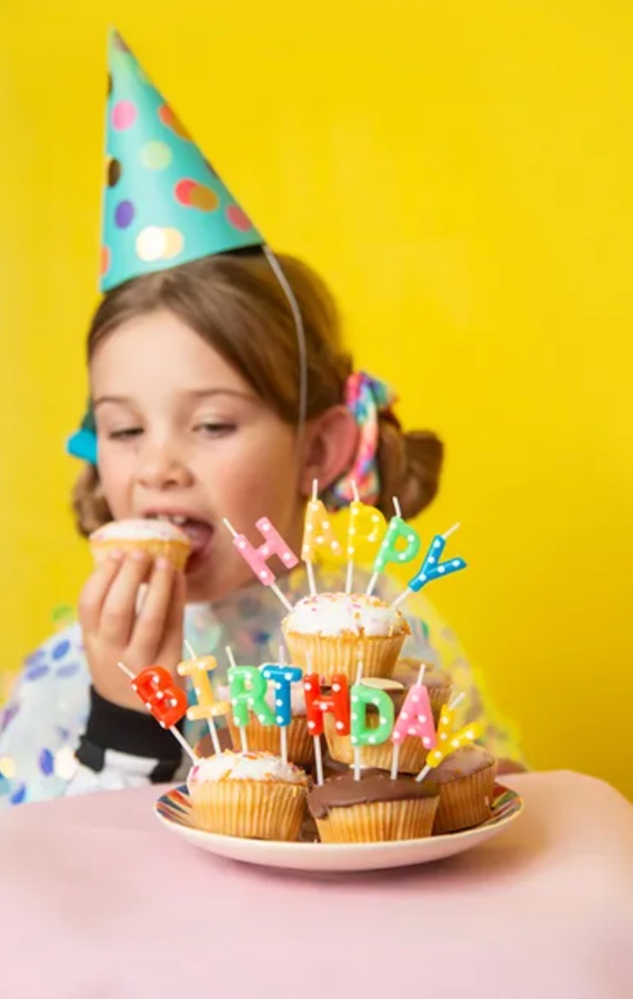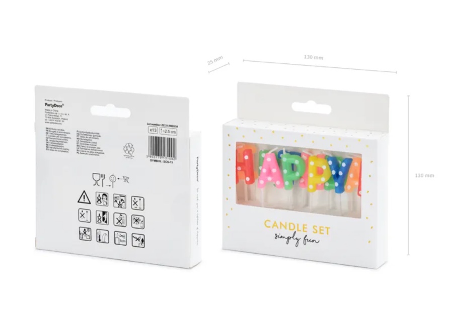 • 1 x świeczki urodzinowe Happy Birthday, mix kolorów z białymi kropeczkami, wysokość ~ 2.5 cm.