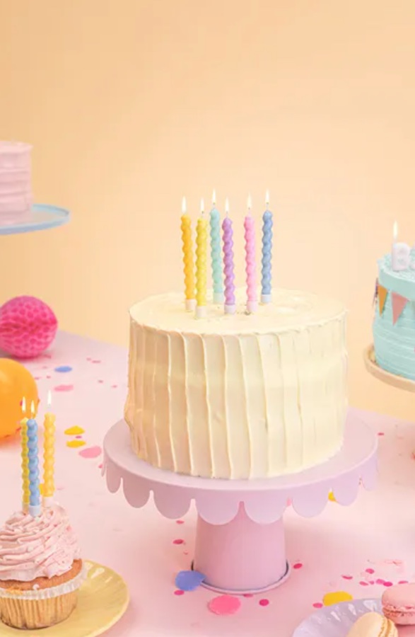 • 1 x świeczki urodzinowe zakręcone, mix pastelowych kolorów (żółty, różowy, zielony, niebieski, pomarańczowy, fioletowy), wysokość ok. 8.5 cm. Zestaw zawiera świeczki i podstawki (1 op. / 6 szt.).