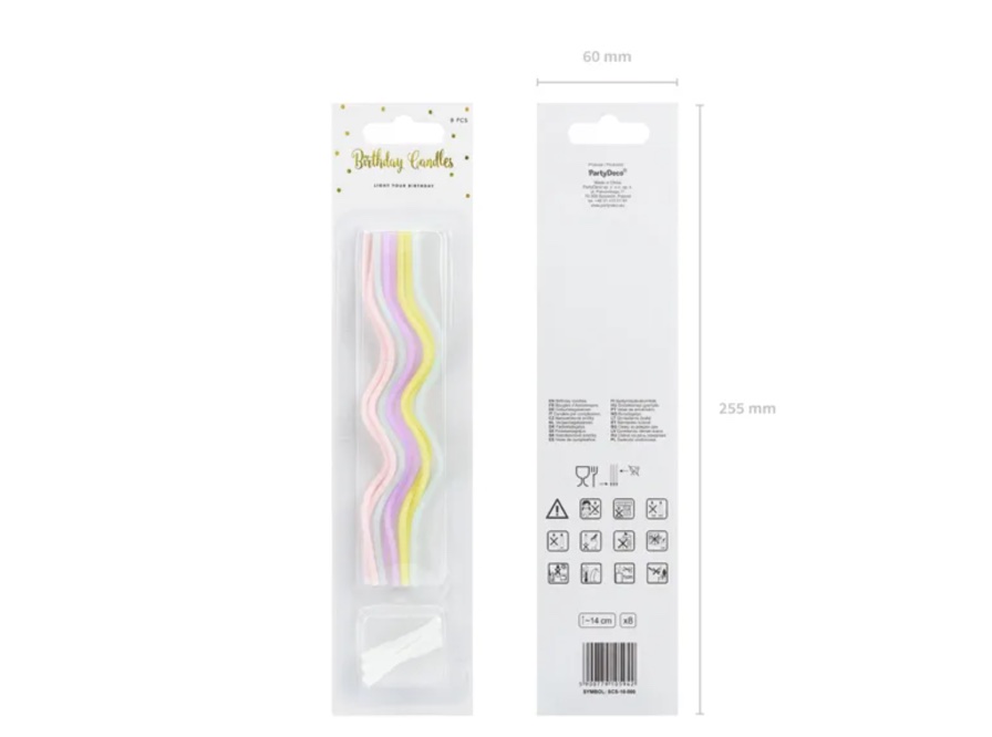 • 1 x świeczki urodzinowe zakręcone, mix kolorów (żółty, różowy, niebieski, fioletowy, zielony), wysokość ~ 14 cm. Zestaw zawiera 8 świeczek i podstawek (1 op. / 8 szt.).