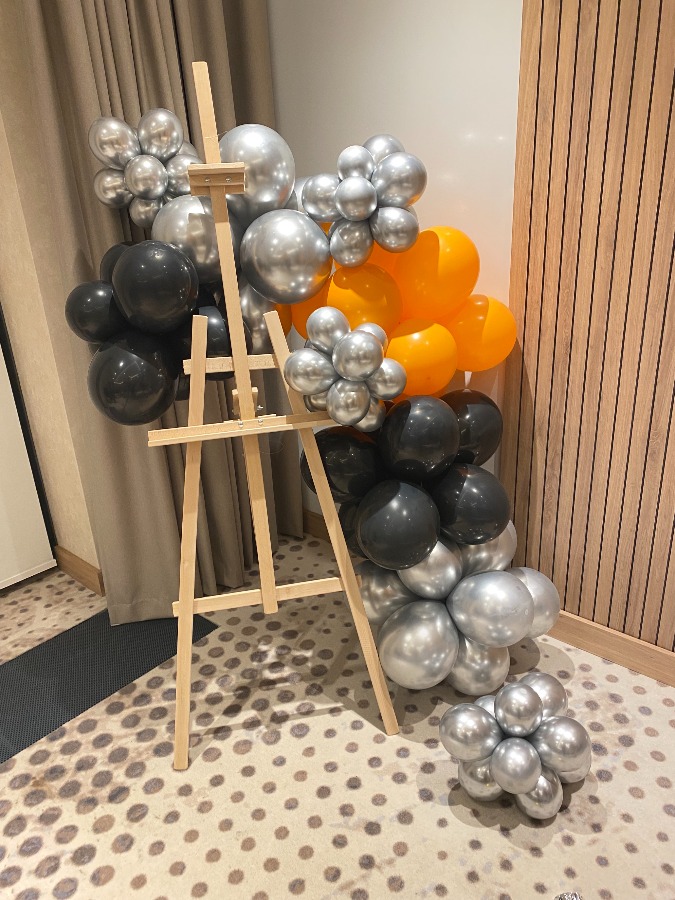 • 1 x drewniana sztaluga w wysokości 170 cm udekorowana girlandą balonową z gumowych balonów w trzech kolorach;