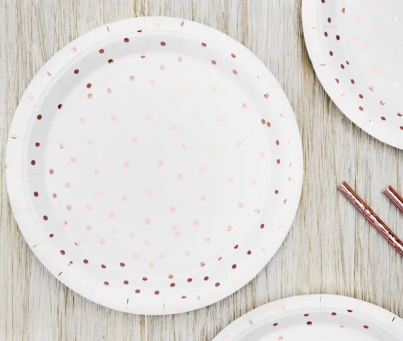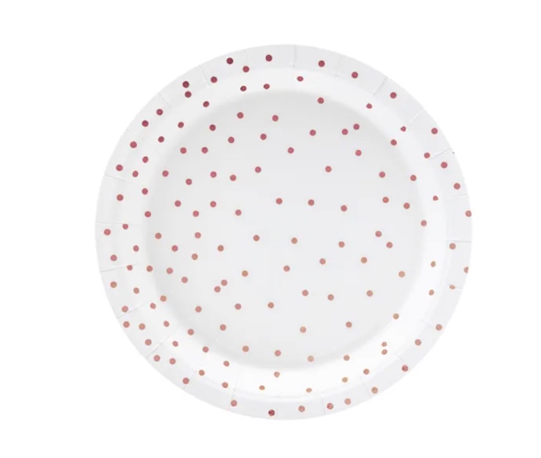 • 1 x talerzyki papierowe, kolor biały ze wzorem kropek w kolorze różowego złota, średnica 18 cm (1 op. / 6 szt.).