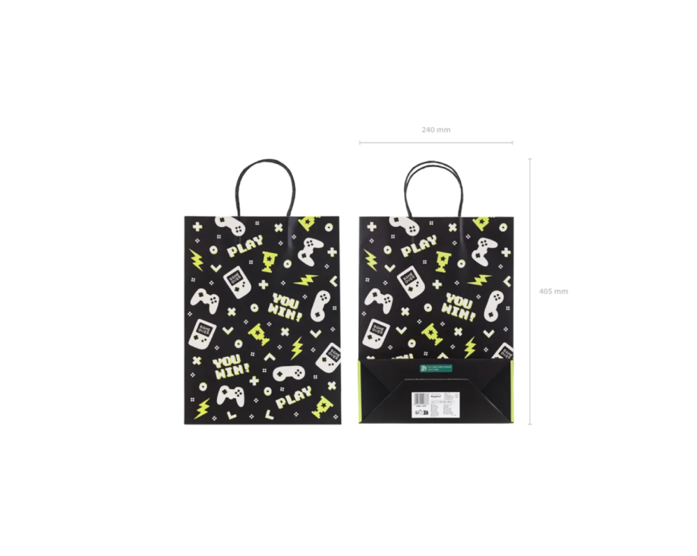 • 1 x torebka na prezenty Gamepady, w kolorze czarno zielonym z kolorowym nadrukiem, wymiary 10 x 24 x 32 cm.