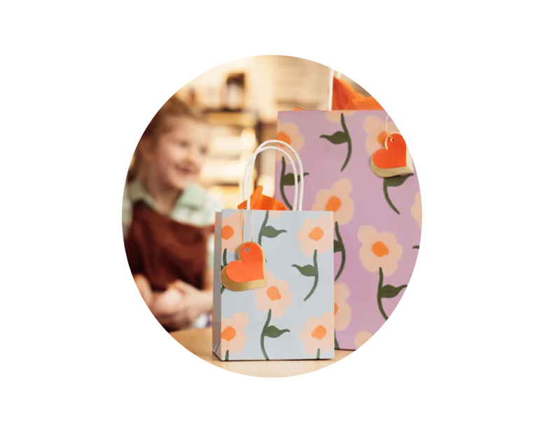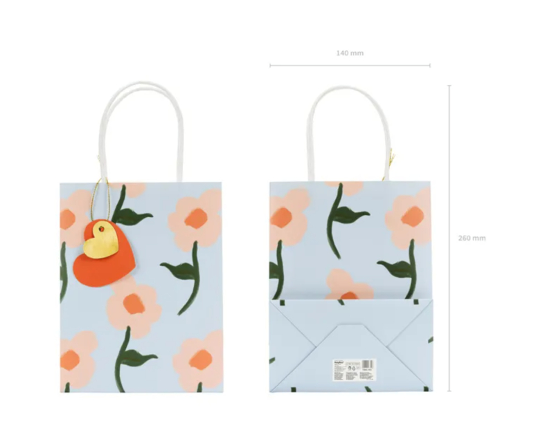 • 1 x torebka na prezenty kwiaty w kolorze niebieskim z kolorowym nadrukiem + 2 zawieszki w kształcie serc, wymiary bez uchwytów 8 x 14 x 18 cm.