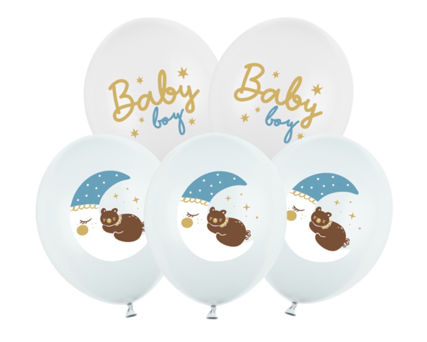 • 3 x balon lateksowy w kolorze Pastel Pure White z dwustronnym nadrukiem Baby boy, rozmiar 30 cm z helem.