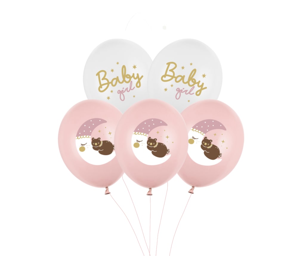 • 2 x balon lateksowy w kolorze Pastel Pale Pink dwustronnym nadrukiem misia, rozmiar 30 cm z helem;