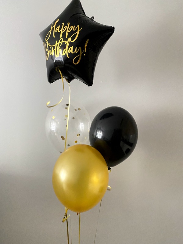 Zestaw składa się z balonu foliowego w kształcie gwiazdy w kolorze czarnym na, którym znajduje się napis Happy Birthday. Pod nim umieszczony jest przezroczysty balon z konfetti w kolorze złotym i balony gumowe złoty i czarny.