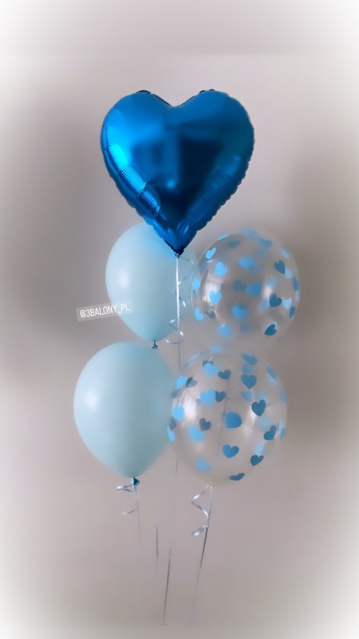 Zestaw składa się z sześciu balonów w odcieniach niebieskiego, tworząc delikatną i harmonijną kompozycję. Dwa przezroczyste balony lateksowe o średnicy 30 cm ozdobione są uroczymi niebieskimi serduszkami, a centralnym elementem bukietu jest 40-centymetrowy foliowy balon w kształcie serca. Dodatkowo całość uzupełniają dwa błękitne balony lateksowe o średnicy 30 cm, wypełnione helem, które unoszą się lekko w powietrzu. Wszystkie balony są połączone eleganckimi wstążkami i przymocowane do ciężarka, zapewniającego stabilność dekoracji.