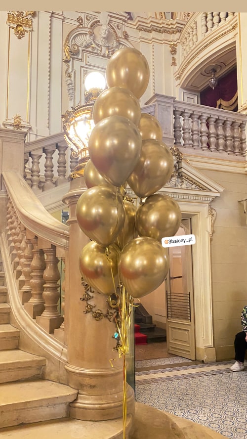 • 22 x balon lateksowy w kolorze glossy gold, rozmiar 30 cm z helem + wstążka ~1,5 m.